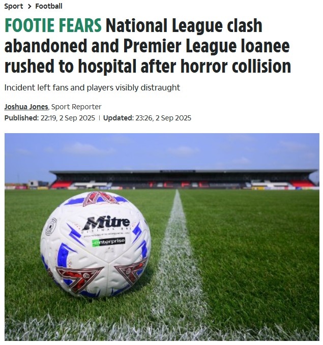 太阳报:英格兰第五级别联赛两球员头部相撞,比赛直接被叫停