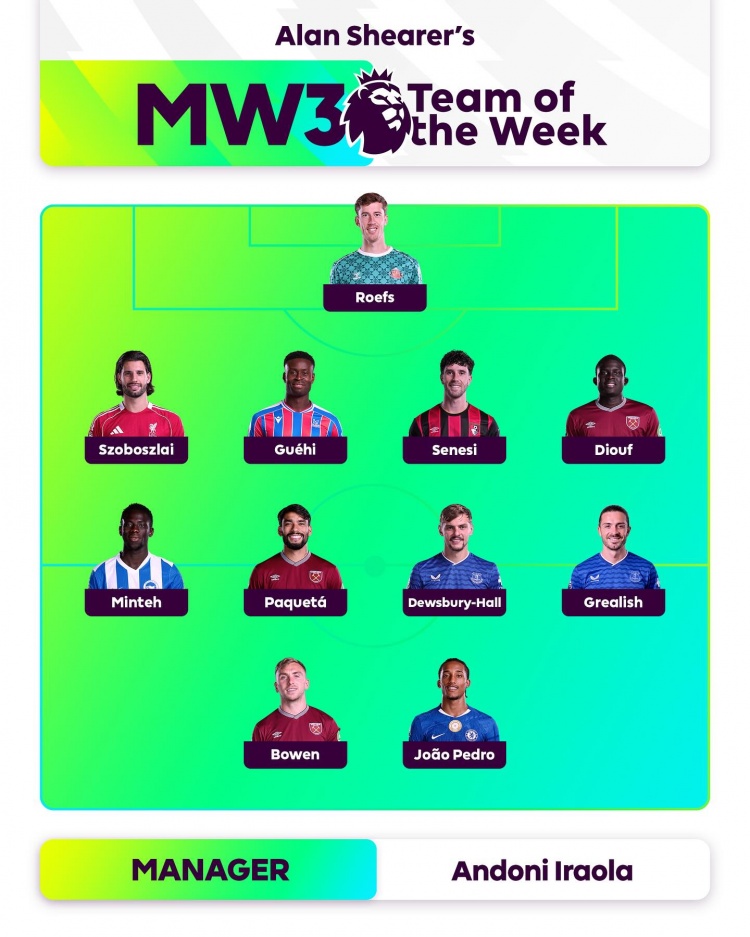9月3日讯 英格兰足坛名宿希勒评出了英超第三轮比赛最佳阵容,若昂-佩德罗、索博斯洛伊、鲍文、格拉利什在列。