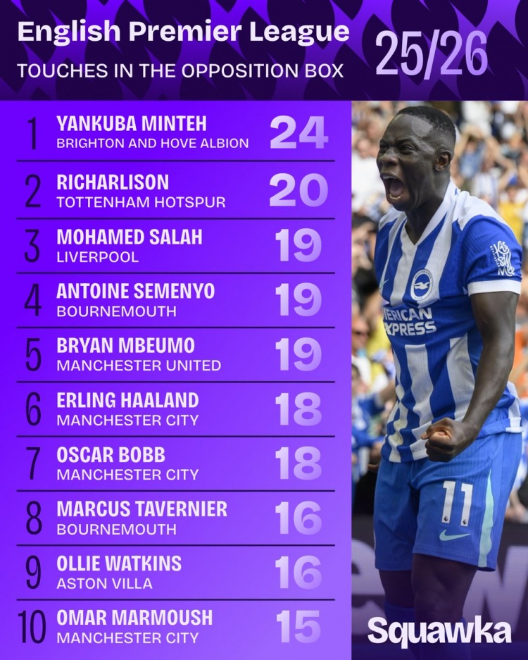 9月3日讯 Squawka统计了英超开赛至今球员在对方禁区内触球的次数,并列出榜单,明特24次居首,理查利森20次第二。