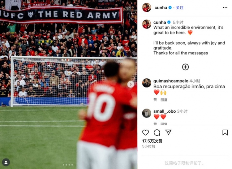 库尼亚社媒晒照:曼联的氛围如此之棒,很荣幸在这里&会尽快回归