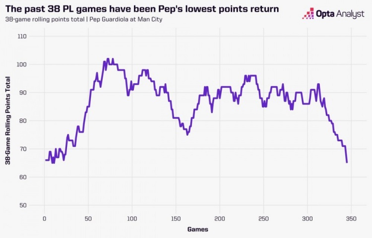 以连续38场联赛的积分而论,这也是曼城自2016年11月以来的最低积分,而彼时瓜帅刚刚执教了11场比赛。
