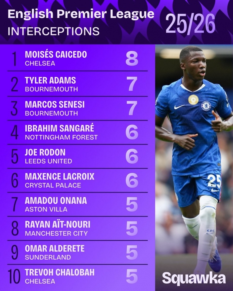 9月3日讯 数据机构squakwa统计了新赛季英超球员拦截情况,凯塞多位列榜首。