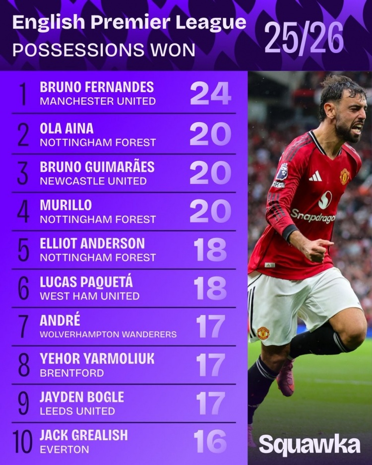 9月3日讯 数据机构squakwa统计了新赛季英超球员赢得球权情况,B费独自领跑。