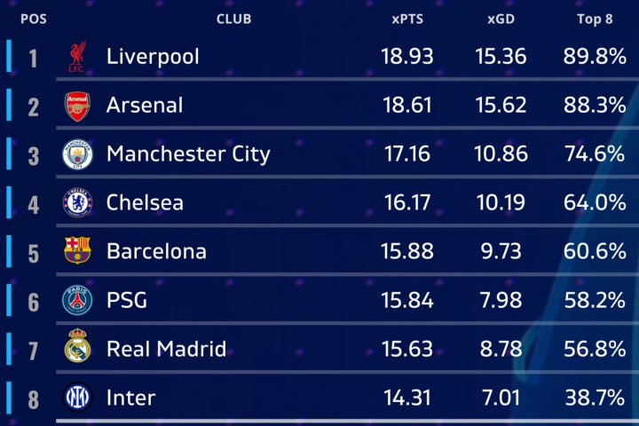 机构预测欧冠联赛阶段排名:军枪城车包揽前四,皇马第七 无拜仁